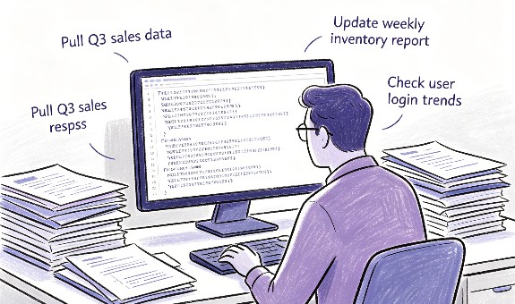 Analyst teams spend 80% of their cycles answering repetitive, low-leverage SQL requests. This leaves zero room for strategic, high-value exploratory analysis that drives growth.